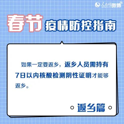 “返乡人员需持7天内有效新冠病毒核酸检测阴性结果返乡,返乡后实行14天居家健康监测,期间不聚集、不流动,每7天开展一次核酸检测。”