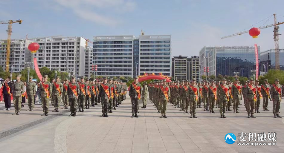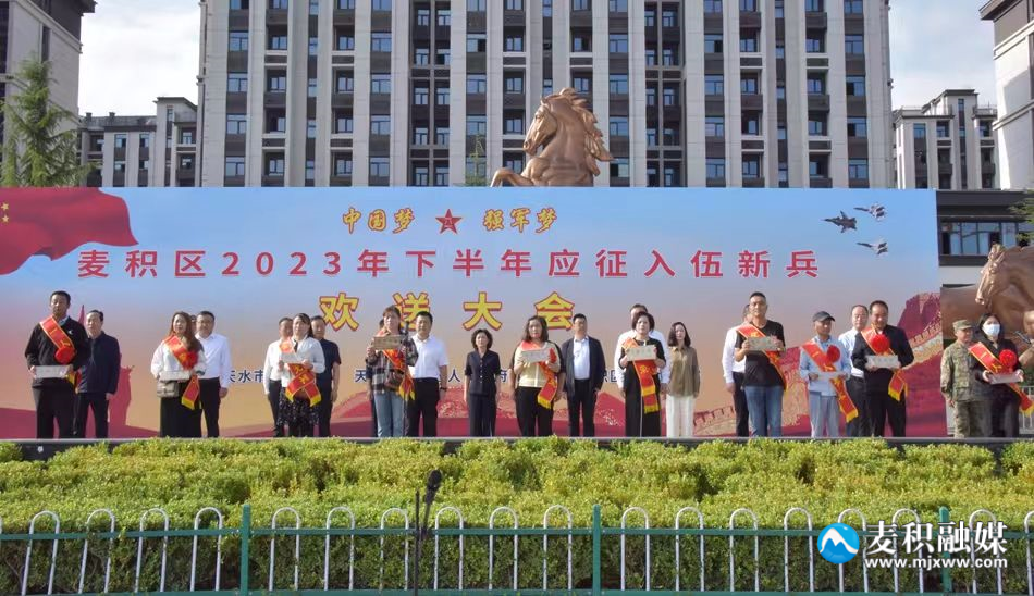 麦积区融媒体中心讯(记者 龙云飞 吕柄辉) 9月15日,麦积区马跑泉市政广场军歌高奏、锣鼓锵锵,麦积区2023年下半年新兵入伍欢送大会在这里隆重举行。麦积区应征入伍的新兵披红挂花、队列整齐,全区各级党政军领导、驻地部队和各界群众代表、新兵家属为新兵送行。