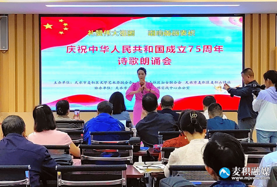 麦积区融媒体中心讯(记者 王惠萍 马玉婷)为热烈庆祝中华人民共和国成立75周年,进一步激发广大群众的爱国情怀与民族自豪感,9月22日,由麦积区文联、麦积区妇联、麦积山诗社主办,麦积区新时代文明实践中心办公室协办的以“礼赞伟大祖国 唱响美丽麦积”为主题的诗歌朗诵会举行,活动吸引了来自各行各业的朗诵爱好者及文艺工作者积极参与。