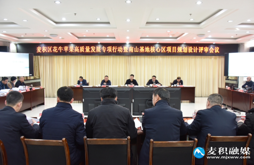 麦积区融媒体中心讯(记者 王雯 吕柄辉)2月8日,麦积区召开花牛苹果高质量发展专项行动暨南山基地核心区项目规划设计评审会议。区委书记赵虎生主持会议并讲话,区委副书记、区长石生勃及区四大组织相关领导、有关专家及区直相关部门负责人参加会议。