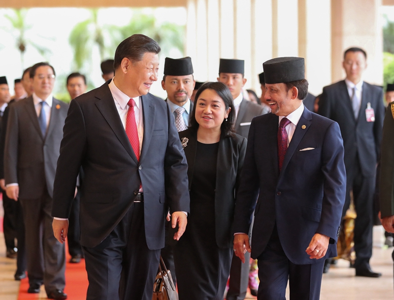 习近平抵达王宫时,哈桑纳尔在停车处热情迎接。两国元首登上检阅台。仪仗队行礼,军乐队奏中文两国国歌。现场鸣放21响礼炮。在哈桑纳尔陪同下,习近平检阅仪仗队。检阅毕,两国元首前往王宫内廷。习近平同文莱王室成员、主要官员及各国驻文莱使节握手。哈桑纳尔同中方陪同人员握手。