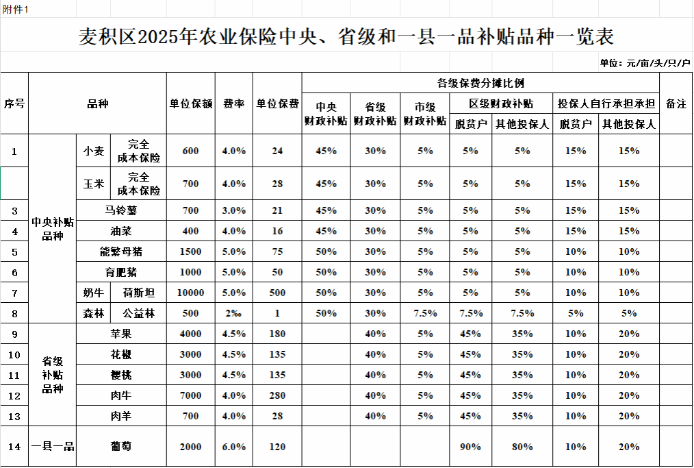 五、麦积区农业保险各品种收费标准